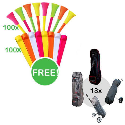 When you purchase: 3x Deluxe Golf Bag Rain Covers 2x Nylon Rain Covers 6x Rain Covers 2x Travel Covers Get: 100x Cushion Tees FREE 100x Wedge T...