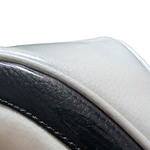 Clean white driver headcover with black and silver accents and a leather-textured finish. A premium, tour-inspired option that appeals to customers...